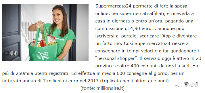 2017年Supermercato24营业额700万欧元,注册用户25万,服务遍布意大利23个省份的400个城市。